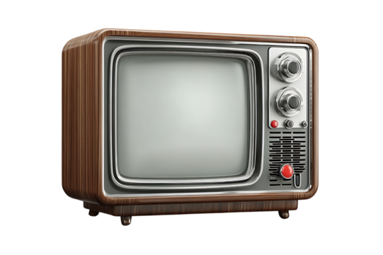 Retro vintage television set with wood grain casing and silver trim from the 1960s isolated on transparent background