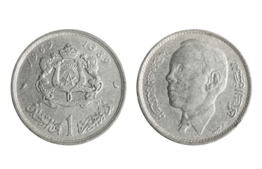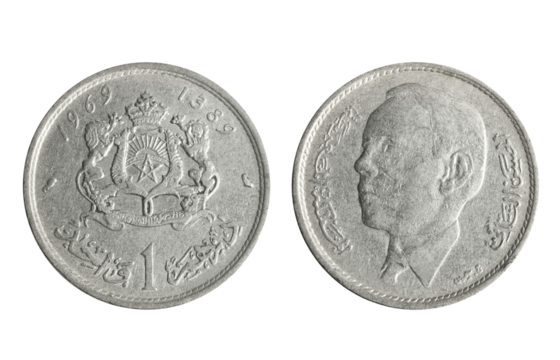 Isolated png photo of 1 Morocco 1969 dirham nickel coin of Kingdom of Morocco 1960-2023 on transparent background.