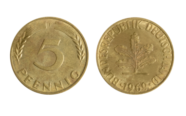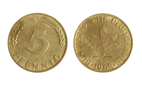 Isolated png photo of 5 German 1969 pfennig brass plated steel coin of Federal Republic 1990-2001 on transparent background.