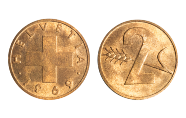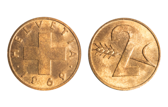 Isolated png photo of 1969 Switzerland 2 rappen bronze coin of Confoederatio Helvetica 1968-2024 on transparent background.