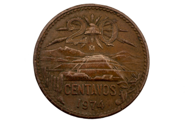 20 centavos de Bronce Mexicanos 1974 con imagen de la pirámide del sol en Teotihuacán, volcanes ixtaccíhuatl y Popocatépetl.