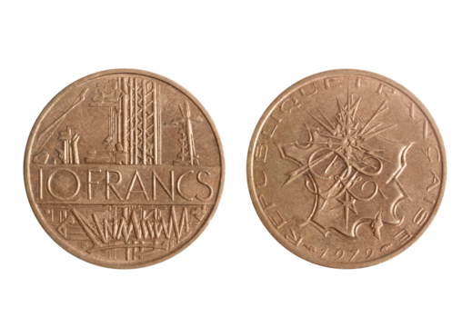 Isolated png photo of 10 French 1979 franc copper-aluminium-nickel coin of Fifth Republic 1959-2002 on transparent background.