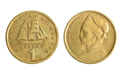 Isolated png photo of 1 Greek 1982 drachmas nickel-brass coin of Third Hellenic Republic on transparent background.