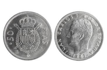 Isolated png photo of 50 Spanish 1983 pesetas copper-nickel coin of King Juan Carlos 1 on transparent background.