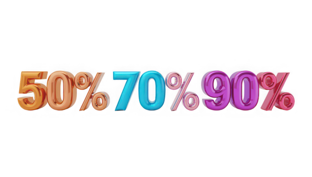 A colorful display of fifty seventy and ninety percent signs against a black background rendering