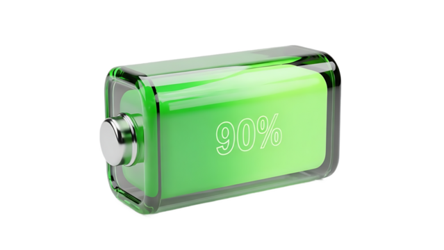 Green battery with 90 percent charge level isolated on a transparent background energy