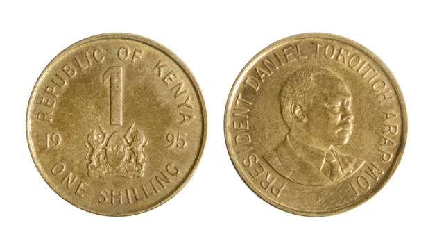 Isolated png photo of 1 Kenya 1995 shilling brass coated steel coin of Republic of Kenya 1966-2018 on transparent background.