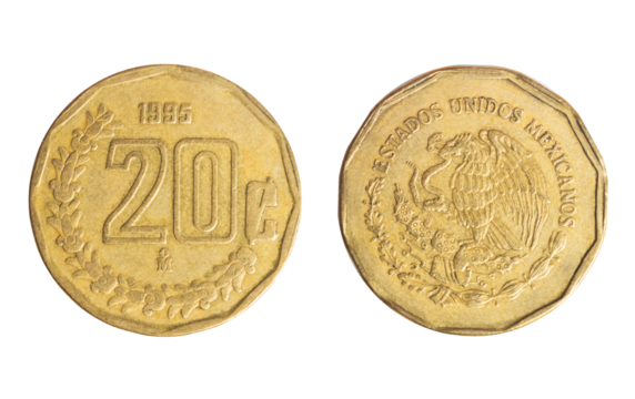 Isolated png photo of 20 Mexican 1995 centavos centavos aluminium-bronze coins on transparent background.