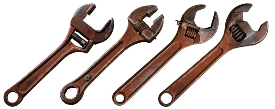 Close-up of an old rusty adjustable wrench, 19th century, isolated on transparent or white background. Png. Collection and variation. Generative Ai.