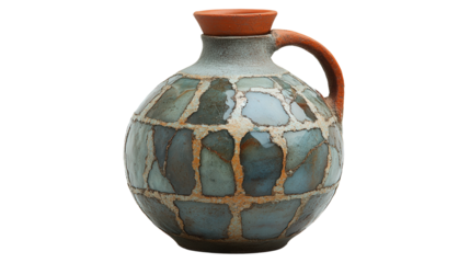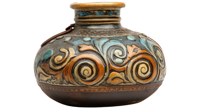 Roman glass-inlaid pottery flask with ornate design, Transparent background, PNG file