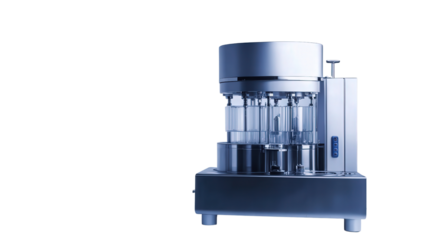 Tall brick industrial chimney stack with square base and cylindrical tower against clear sky background, isolated on a transparent background