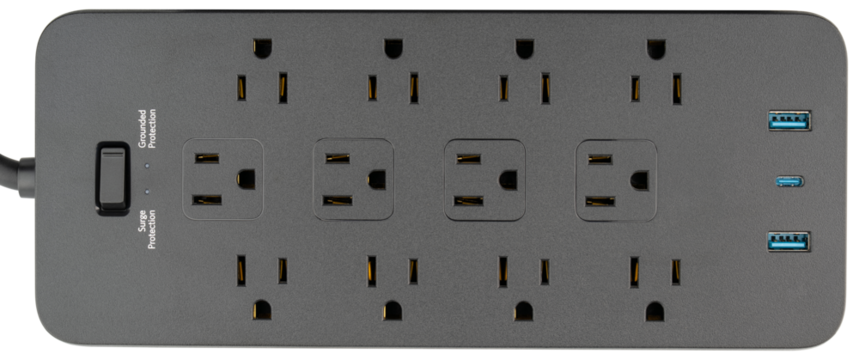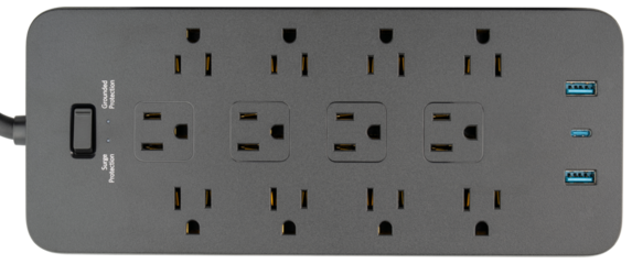 Power strip. Surge protector with 12 Outlets, USB and USB-C Ports type A class 5V 2.1A. Extension electric cord. Black cord, with flat plug. Wall Mount, desktop charging station for home, office, dorm