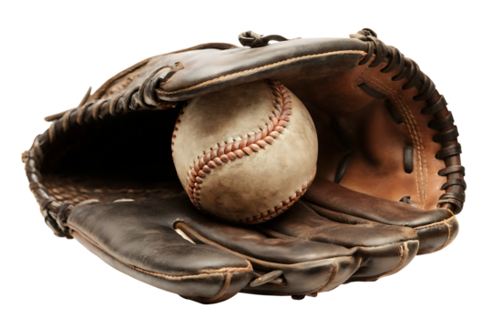 vintage baseball glove holding an old baseball on white background PNG.AI GENERATED