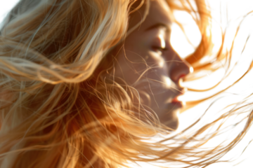 closeup photo portrait of a beautiful young caucasian blonde female model woman shaking her beautiful hair in motion. ad for shampoo conditioner hair products. isolated on white background first pers