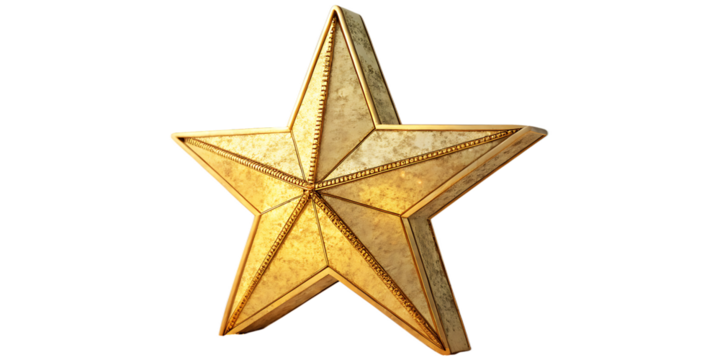 A radiant gold star shines brightly against a stark black backdrop, offering a classic symbol of achievement, celebration, or festive decoration with metallic texture, transparent background