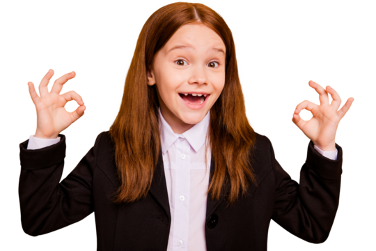 Close-up portrait of nice attractive confident content cheerful cheery optimistic pre-teen girl learner showing two double ok-sign cool ad advert isolated over beige pastel background
