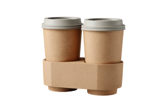 3D Two coffee cups with lids in a beige cardboard carrier on transparent background