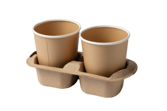 Two disposable coffee cups in a black plastic holder tray, isolated on transparent background