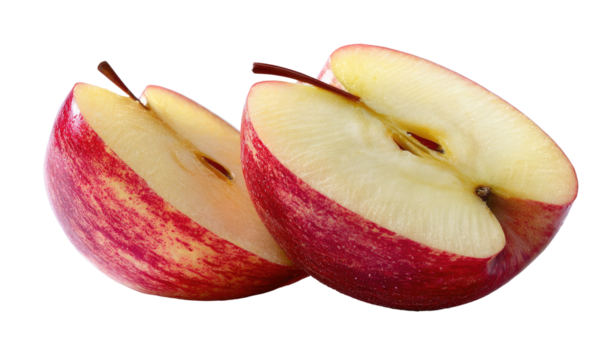 Two halves of a red apple, showing seeds and white flesh