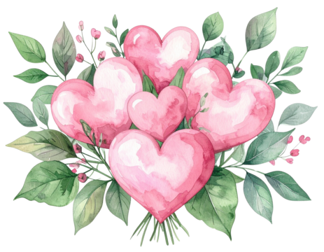 Untitled design - Watercolor Bouquet of Pink Heart Shapes With Green Leaves, Romantic Clipart, Isolated on Transparent Background (2)