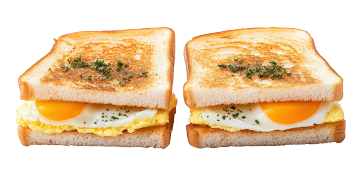 Two Delicious Fried Egg Toast Sandwiches, on transparent background