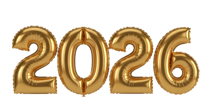 Golden foil balloons forming the number 2026 isolated on transparent background