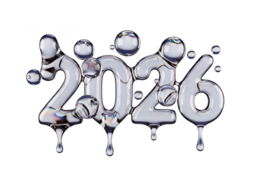 Isolated Metallic iridescent rendering of the date 2026, indicating the year two thousand twenty-six