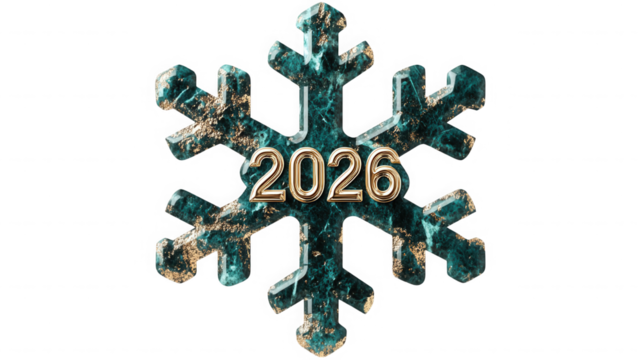 A textured snowflake with the year two thousand twenty six in gold on  on transparent background