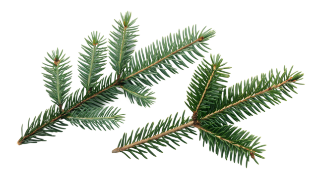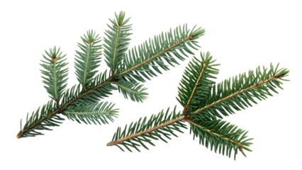 Two pine branches with green needles are arranged on a isolated on transparent background