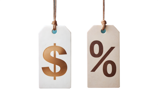 Two hanging tags, one with a dollar sign and the other with a percent sign, isolated on transparent background