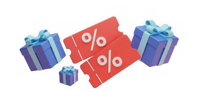 Two red tickets with percent symbols and three purple gift boxes... isolated on a transparent background