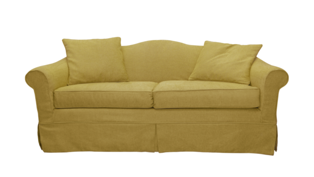 Yellow sofa with two pillows isolated on white, transparent background, PNG. Classic english style two seater cushion couch with upholstery cover, front view