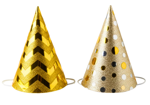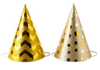 Two gold glitter party hats on transparent background for celebration