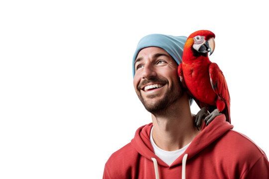 smiling young man Red macaw perches on a shoulder,Isolated on a transparent background.