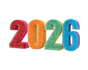 A colorful fluffy rendering of the year twenty twenty six on a black isolated studio background