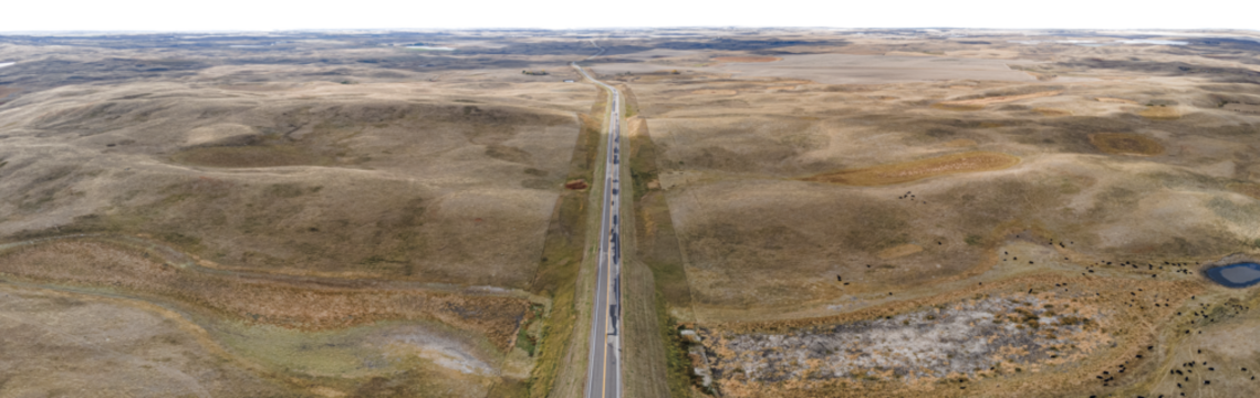 Aerial drone view of a rough paved road running through dry desert like ranch land. Transparent sky.