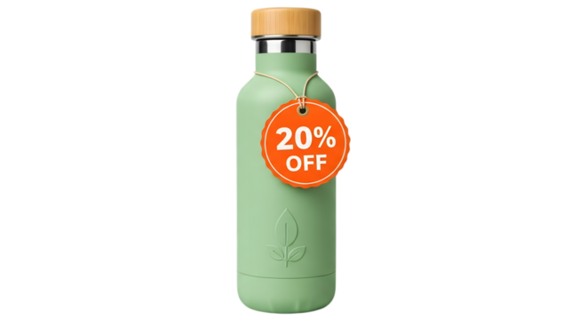 Green reusable water bottle isolated on transparent background with 20 percent off tag