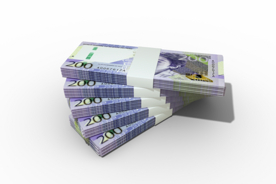 3d rendering of Stacks of 200 Peruvian soles notes. bundles of Peru currency notes isolated on transparent background