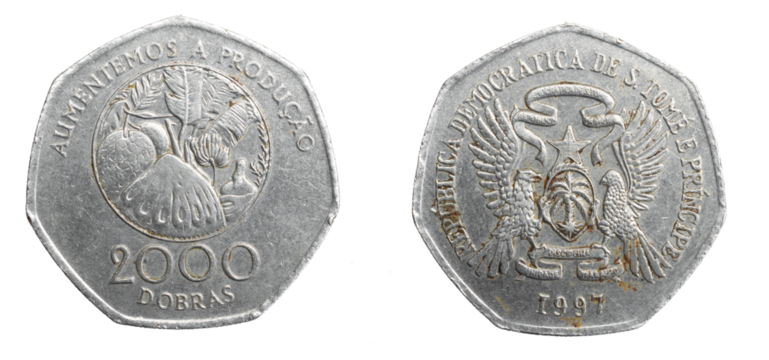 Saint Thomas island two thousand dobras coin on white isolated background