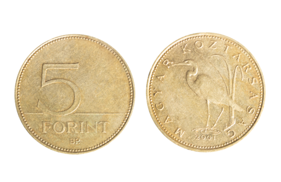 Isolated png photo of 5 Hungarian 2001 forint nickel-brass coin of Third Republic 1990-2024 on transparent background.