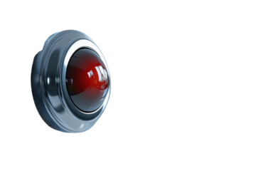 An ominous red eye glows intensely from a chrome orb evoking feelings of surveillance and sci on transparent background