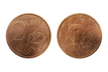 France 2 Euro Cent 2008 coin, made of Copper-plated steel, young Marianne, symbol of liberty, Africa and Asia, 12 stars of the European Union