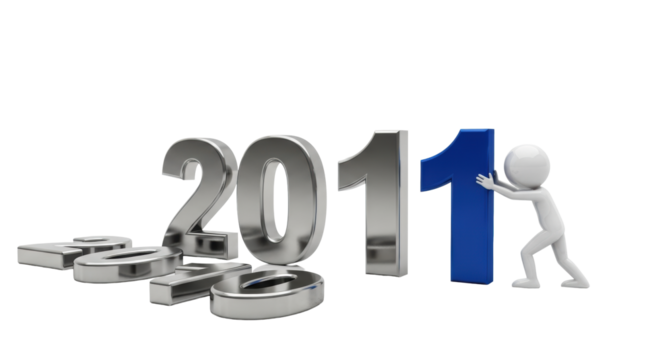 stylized white 3d conceptual figure pushing massive deep blue number '1' to complete '2011', highly reflective white studio background with maximum copy space. Concept of new year transition and