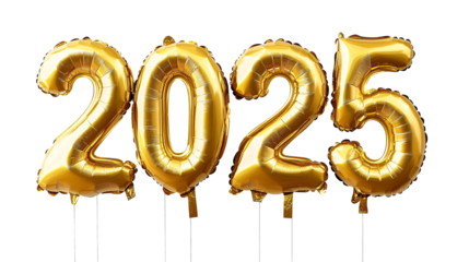 Gold foil balloons shaped like the numbers 2025 isolated on a white and transparent background, a 3D rendering illustration of a new year celebration concept.