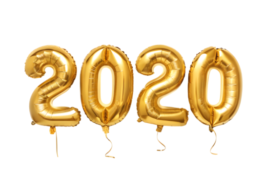 Golden number balloons displaying the year 2020 against a black background