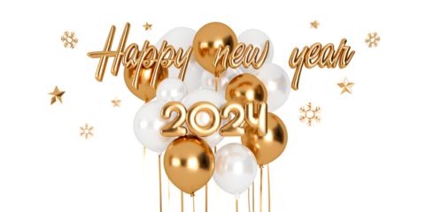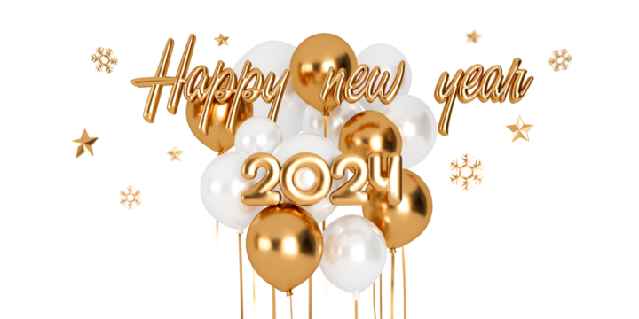 Golden and white balloons with 2024 gold text on white background