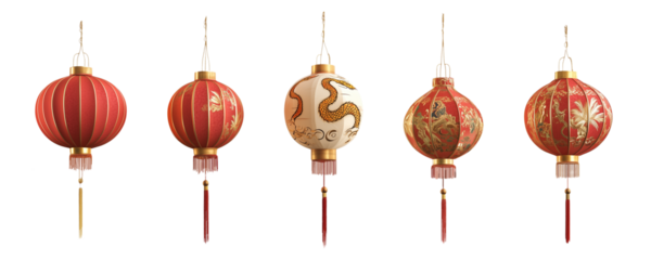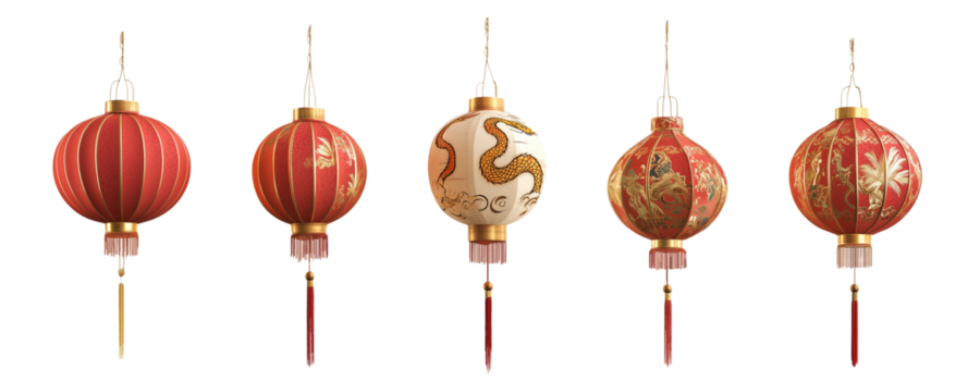 Red chinese paper lanterns on the transparent background, with wavy long dragon drawings and ornament decorations. Design elements.