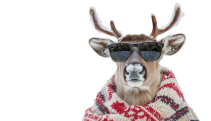 A trendy reindeer in sunglasses and a festive sweater, showcasing humor and style against a snowy background.