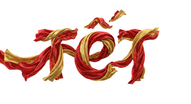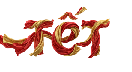Elegant Tet Typography with Flowing Red and Gold Silk Ribbons for Lunar New Year Celebration Isolated on White.