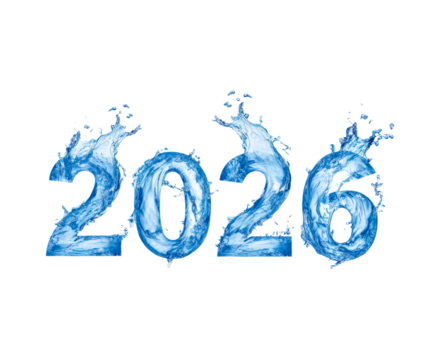Crystal clear water splashing 2026 design for new year visuals and greetings on transparent background, PNG